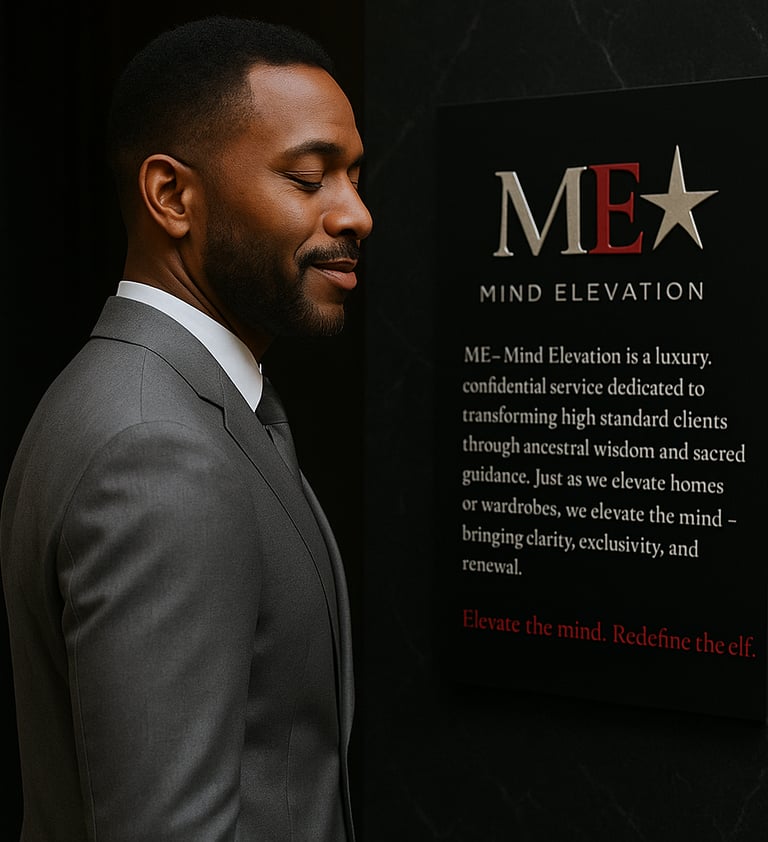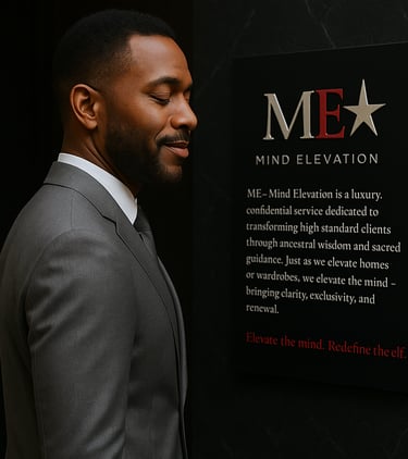 ME – Mind Elevation is a luxury, confidential service dedicated to transforming high-standard clients through ancestral wisdom and sacred guidance. Just as we elevate homes or wardrobes, we elevate the mind – bringing clarity, exclusivity, and renewal. With discretion and prestige, we create spaces where leaders and visionaries can redefine themselves and rise into higher consciousness.